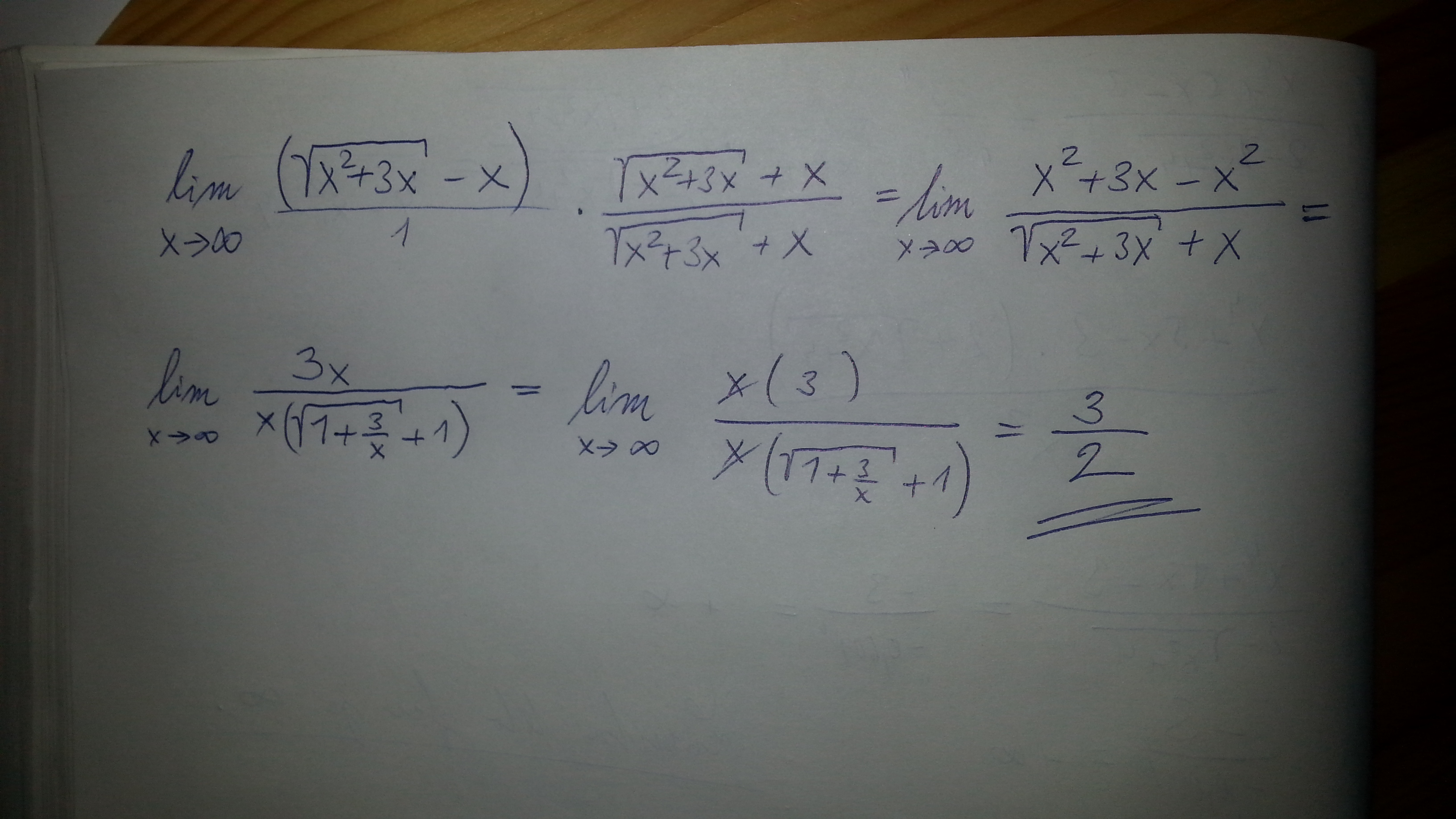 já bych to rozšířil výrazem (odm(x^2+3x)+x)/(odm(x^2+3x)+x)- pak se snaž vytknout z jmenovatele x a zkrátit... Zkus to dopočítat sám :-) Jestli to nepůjde, tak napiš :-)